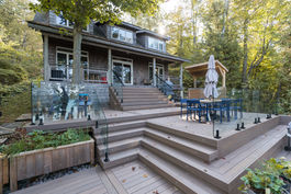 This exterior renovation seamlessly blends modern design with natural beauty, showcasing a striking blue accent wall that adds character and depth to the home’s façade. The bold choice of color complements the surrounding landscape, drawing attention to the home’s unique charm. With its refreshed exterior, the real showstopper remains the breathtaking lake views, now perfectly framed by the updated design. This transformation not only enhances the home's curb appeal but also creates an inviting space where modern aesthetics meet serene waterfront living.
